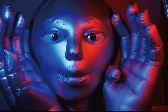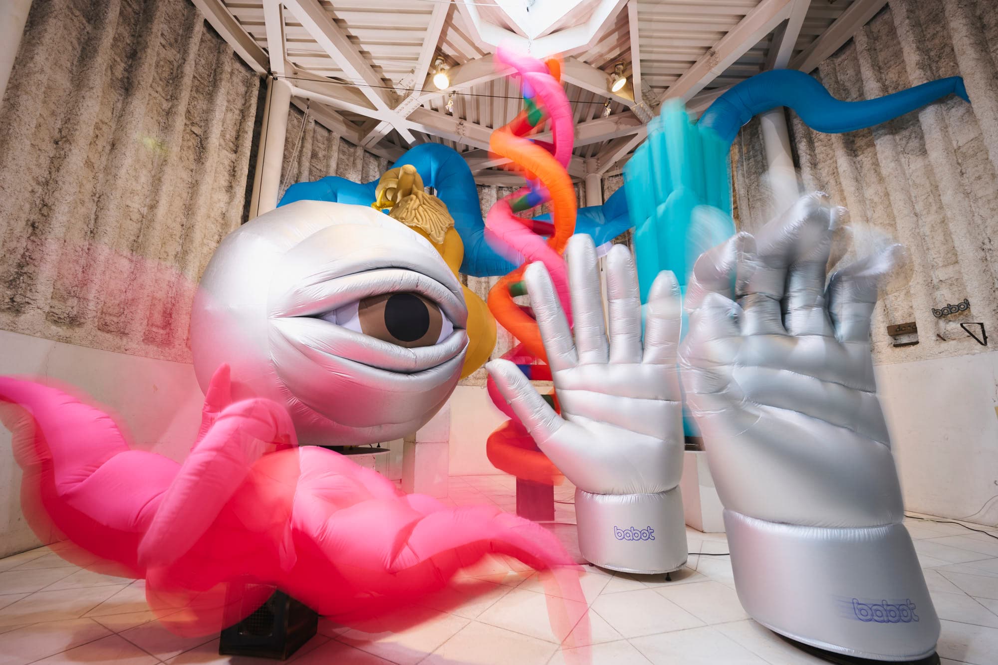 「風船」と呼ばれる膜体の呼称を、高橋は「空気膜造形」と提唱。膨らませれば巨大化し、しぼませればコンパクトになる空気膜造形は、大きさと重量が比例しないことから、自由自在なスケール感で扱うことができます。すぐに現れて消える性質は、ハレとケの演出にも適します。また空気膜造形に動作機構を組み込むことで、金属質で硬いロボットのイメージを刷新する“やわらかいロボット”として、後述する社名「babot(バボット)」にも用いました。